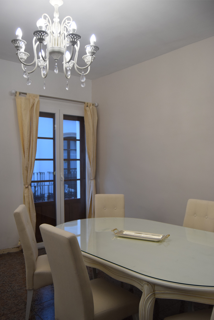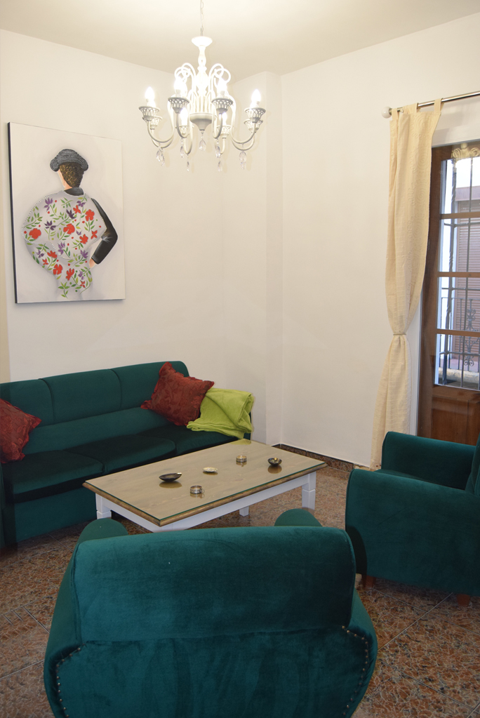 El salón espacioso y elegante muy luminoso cuenta con un sofá, 2 sillones, TV de pantalla plana LED 42″ y dos balcones con vistas fabulosas a la calle típica andaluza.